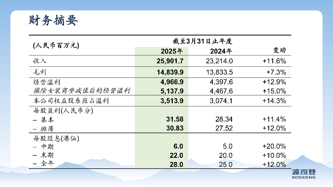 波司登(03998.HK)最新发布了2024/25财年(截至2025年3月31日)业绩报告显示,集团实现收入259.02亿元,同比增长11.58%;公司权益股东应占净利润35.14亿元,同比增长14.31%,并拟派发末期股息每股22港仙。值得注意的是,波司登经营溢利增速已连续8年跑赢收入增速,展现出强劲的增长韧性与经营效率。