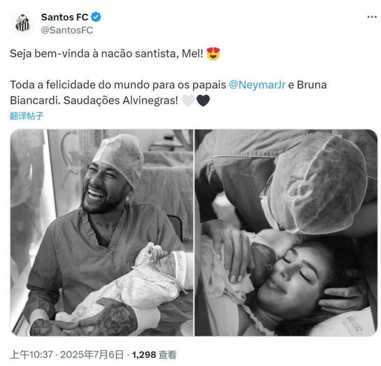 直播吧7月6日讯 桑托斯俱乐部更新社媒动态,祝贺内马尔喜得千金。