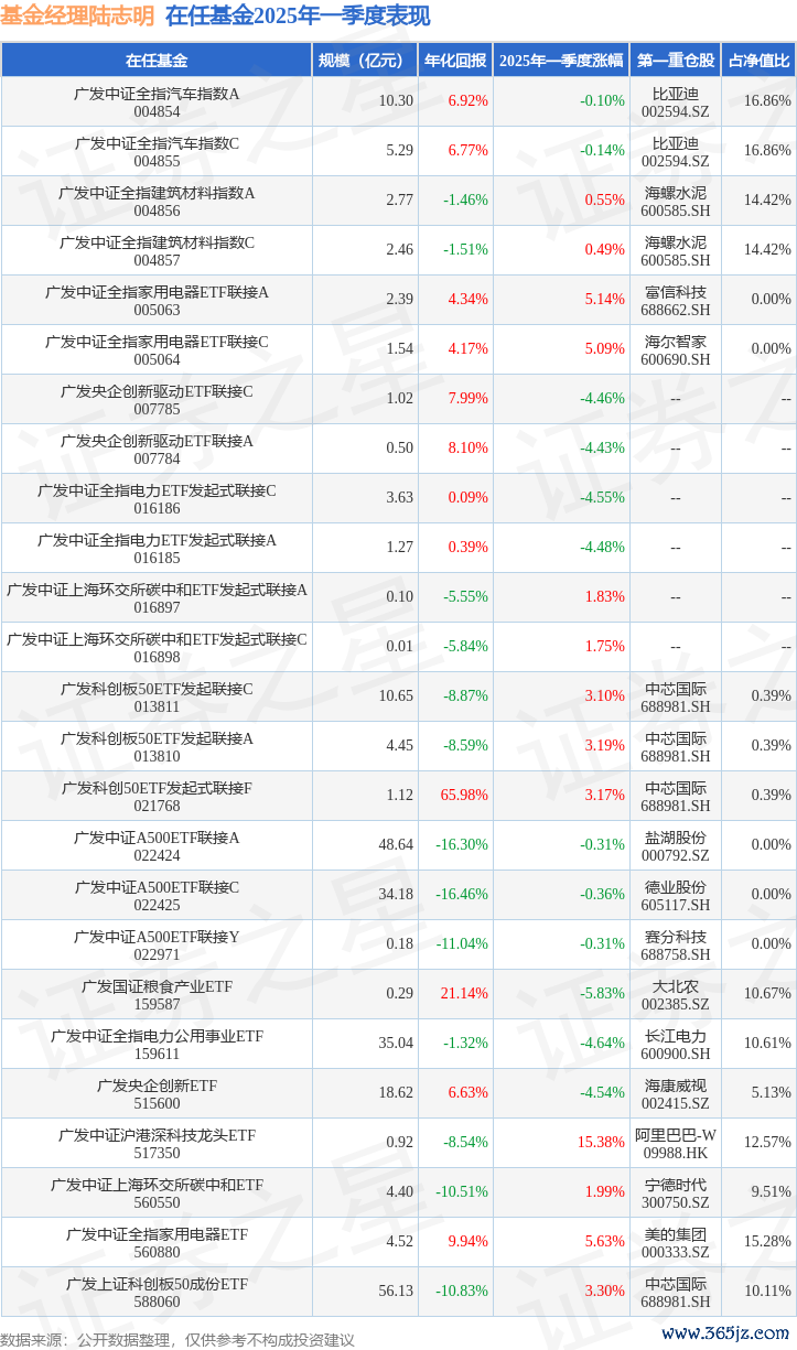 广发上证科创板50成份ETF现任基金经理为陆志明。其中在任基金经理陆志明已从业13年又327天,2021年7月15日正式接手管理广发上证科创板50成份ETF,任职期间累计回报为-35.09%。目前还管理着25只基金产品(包括A类和C类),其中本季度表现最佳的基金为广发中证沪港深科技龙头ETF(517350),季度净值涨幅为15.38%。