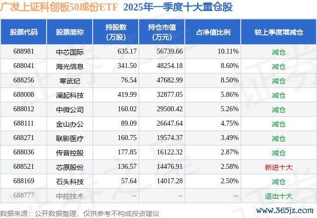 从基金规模来看,广发上证科创板50成份ETF基金2025年一季度公布的基金规模为56.13亿元,较上一期规模64.13亿元变化了-8.0亿元,环比变化了-12.48%。该基金最新一期资产配置为:股票占净值比97.48%,无债券类资产,现金占净值比0.26%。从基金持仓来看,该基金当季前十大股票仓位达54.52%,第一大重仓股为中芯国际(688981),持仓占比为10.11%。